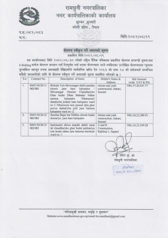रामधुनी नगरपालिकाको आन्तरिक राजस्व संकलन ठेक्का आह्वान सूचना