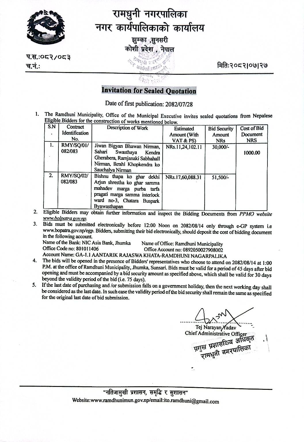 रामधुनी नगरपालिकाको आन्तरिक राजस्व संकलन ठेक्का आह्वान सूचना