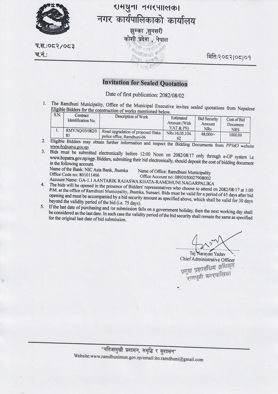 रामधुनी नगरपालिकाको आन्तरिक राजस्व संकलन ठेक्का आह्वान सूचना