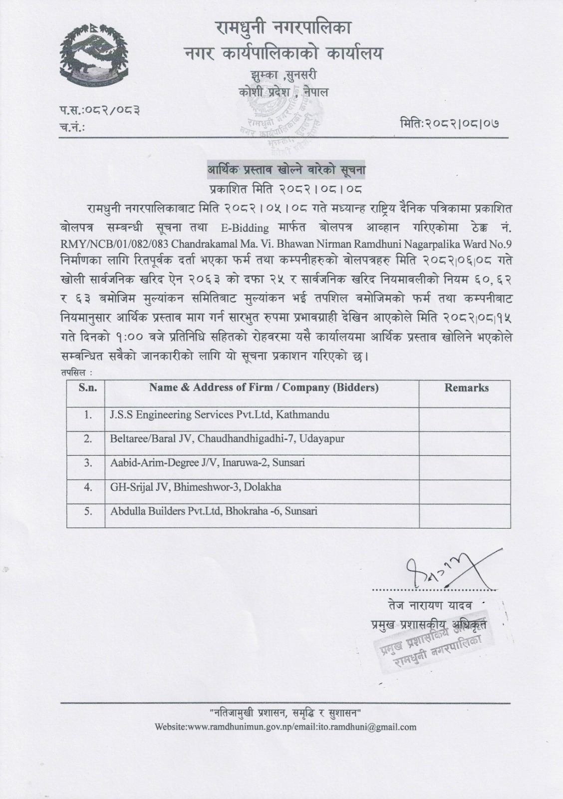 आर्थिक प्रस्ताब खोल्ने बारे सूचना