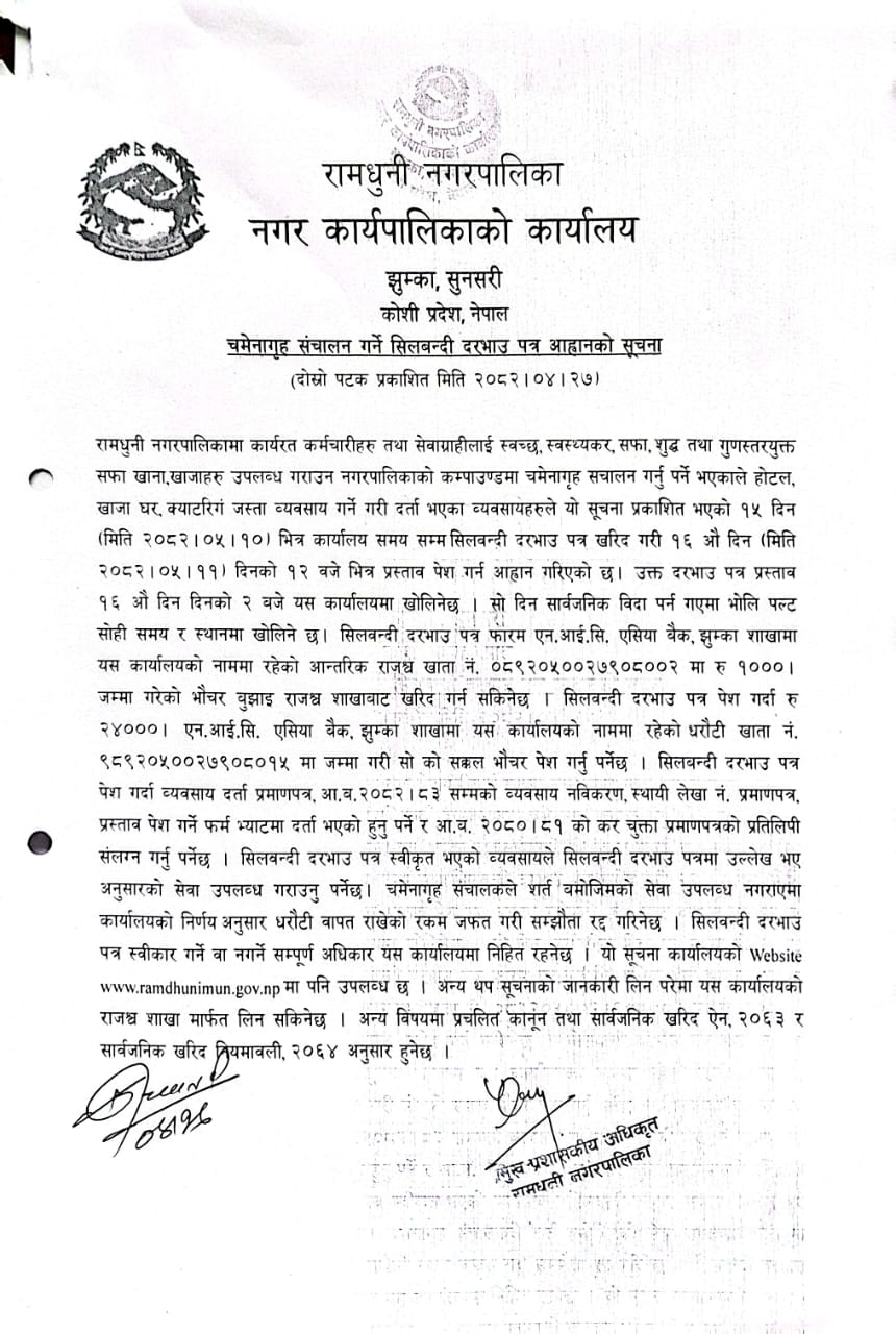 रामधुनी नगरपालिकाको आन्तरिक राजस्व संकलन ठेक्का आह्वान सूचना