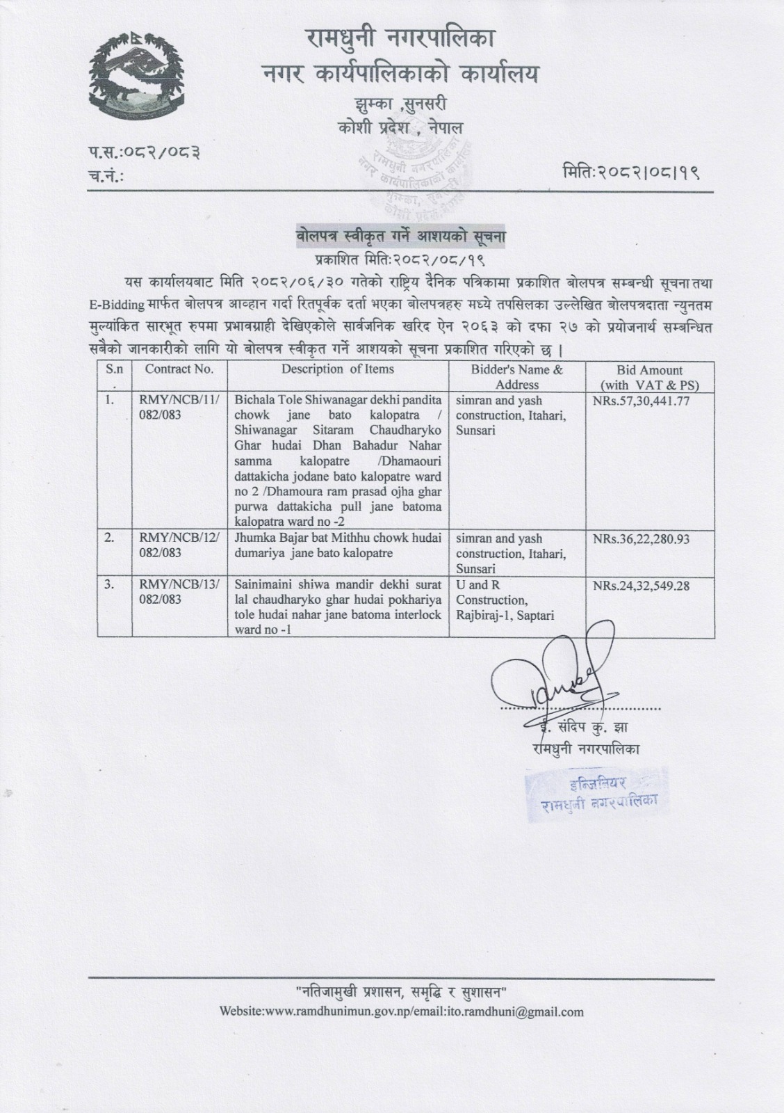 रामधुनी नगरपालिकाको आन्तरिक राजस्व संकलन ठेक्का आह्वान सूचना