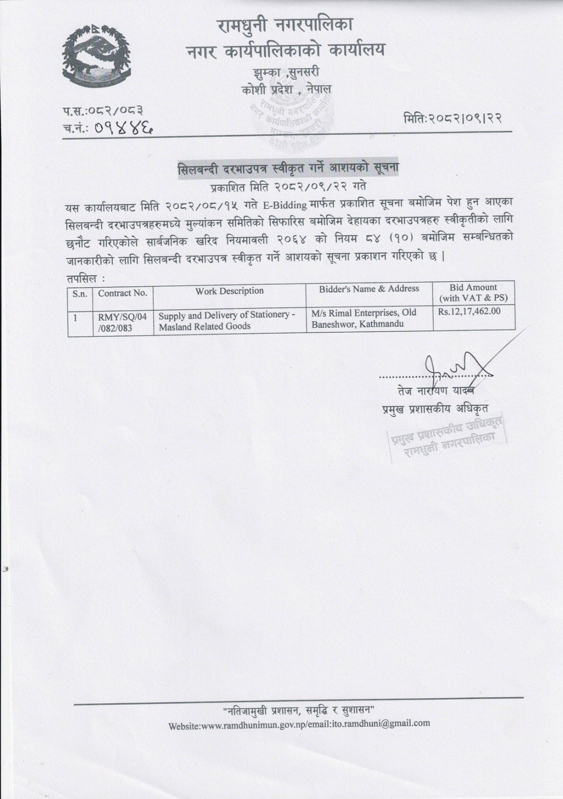 बोलपत्र स्वीकृत गर्ने आशयको सूचना