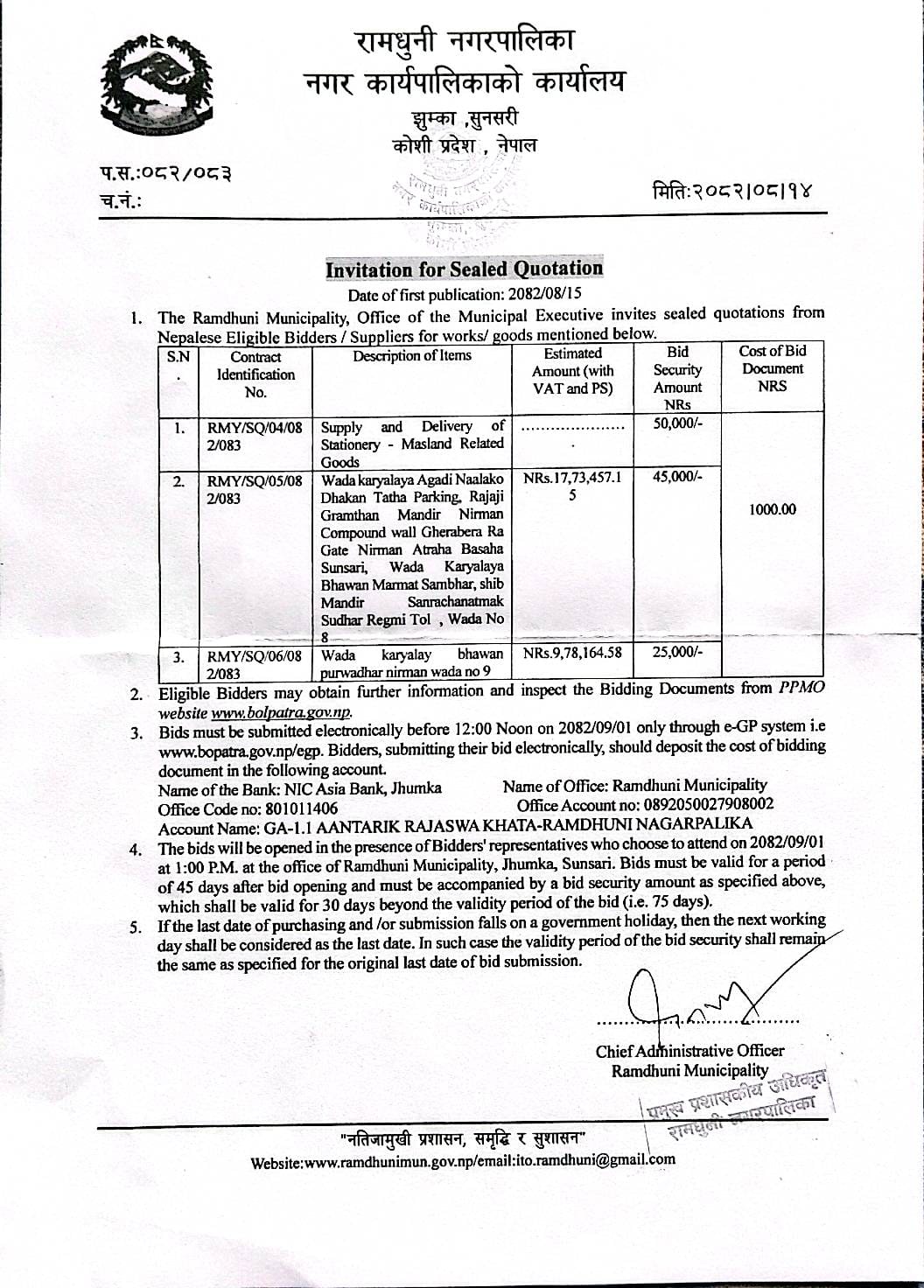 रामधुनी नगरपालिकाको आन्तरिक राजस्व संकलन ठेक्का आह्वान सूचना
