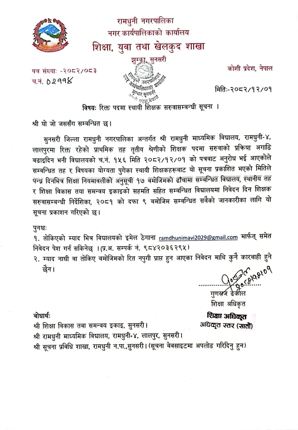 रिक्त पदमा स्थायी शिक्षक सरुवा सम्बन्धी सूचना ।