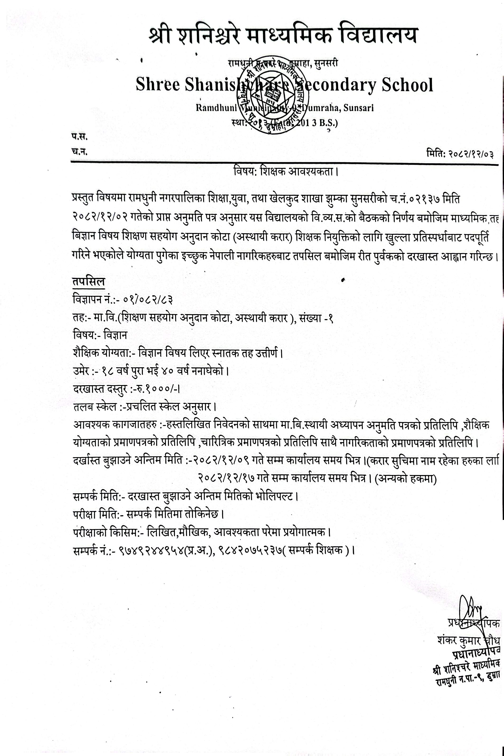 शिक्षक आवश्यकता सम्बन्धी सूचना