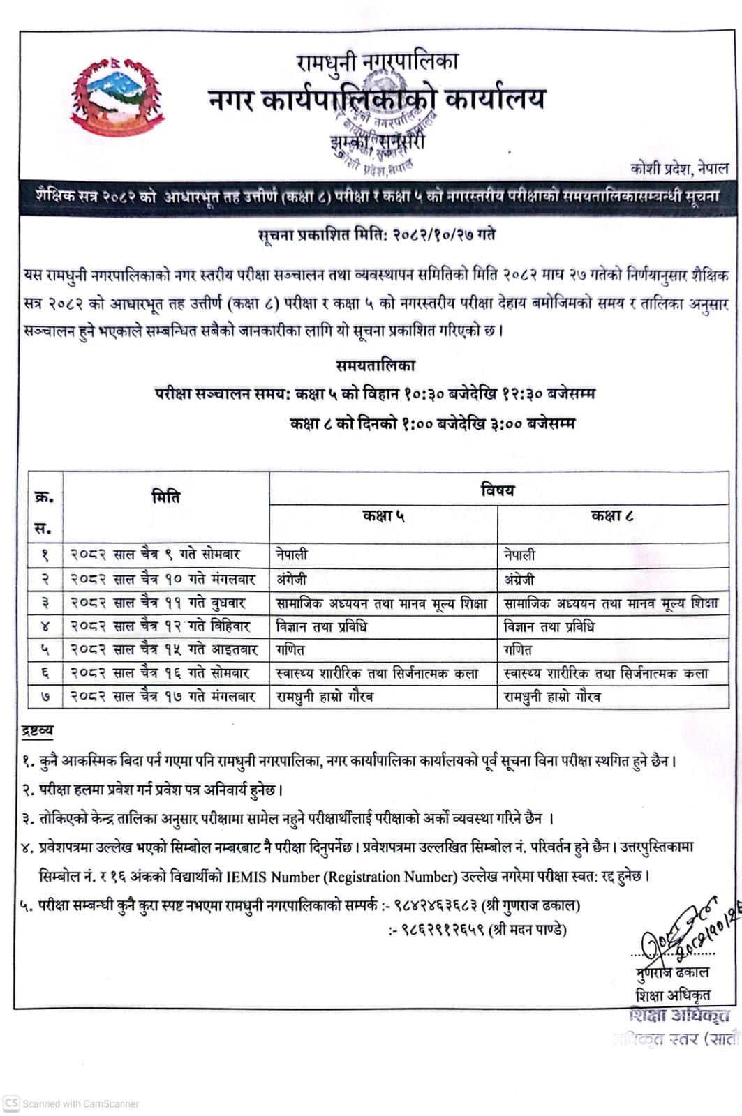 शैक्षिक सत्र २०८२ को आधारभूत तह उत्तीर्ण (कक्षा ८) परीक्षा र कक्षा ५ को नगरस्तरीय परीक्षाको समयतालिका सम्बन्धी सूचना